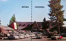 The Cal Neva Lodge and Casino overlooks Lake Tahoe with the property split across the California–Nevada border near Crystal Bay.[55][63] The main dining room has a white line indicating the state border running down the middle of the room,[64] and continues outside through a swimming pool.[25] The interior is decorated in the lodge-style.[65] The entrance has been replaced several times over the years, although the exterior of the buildings have remained almost the same since the reconstruction.[66] Prior to the expansion under Sinatra, the lodge had 55 rooms and 11 lodges,[65] but this was increased to 220 lake-facing rooms following the expansion in 1969.[46][67] As of 1998, it had 182 rooms and suites and eight conference rooms, catering for up to 400 people.[57]