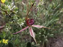 Caladenia ampla, commonly known as the dainty spider orchid,[2] is a plant in the orchid family Orchidaceae and is endemic to Victoria. It is a ground orchid with a single hairy leaf and a single flower which is sometimes yellowish-green flower with red stripes and sometimes entirely red.