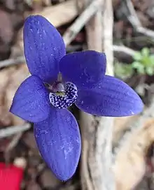 The blue china orchid is a common and widespread china orchid found between Kalbarri in the north and Israelite Bay in the east, growing in a range of habitats from heath to forest. Plants growing in wetter areas tend to flower more profusely after summer fires.[2][3][4][9]