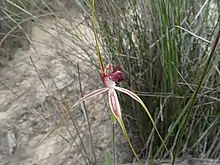 Caladenia lorea was first described in 2001 by Stephen Hopper and Andrew Phillip Brown from a specimen collected in Cockleshell Gully near Jurien Bay and the description was published in Nuytsia.[1] The specific epithet (lorea) is derived from the Latin word lorum meaning "strap" or "thong"[5] referring to the long "clubs" on the sepals and petals.[3]