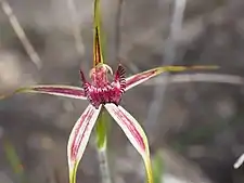 Blushing spider orchid occurs between Yanchep and Leeman with an isolated population south of Bunbury, in the Geraldton Sandplains, Jarrah Forest and Swan Coastal Plain biogeographic regions where it grows in areas that are wet in winter.[2][3][4][6]