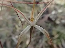 Caladenia microchila, commonly known as the western wispy spider orchid, is a species of orchid endemic to the south-west of Western Australia. It is relatively common orchid with a single erect, hairy leaf and up to three wispy white flowers with narrow lateral sepals and petals and a white labellum with red markings.