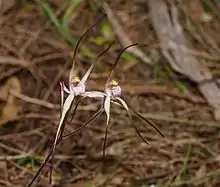 The candy spider orchid is only known from two populations in Victoria, south-west of Stawell where there are about 800 plants and east of Balmoral where 175 individuals were recorded in 2012. It grows in woodland.[2][3][4]