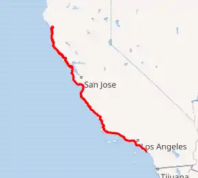 SR 1 is part of the California Freeway and Expressway System,[5] and through the Los Angeles metro area, Monterey, Santa Cruz, San Francisco metro area, and Leggett is part of the National Highway System,[6] a network of highways that are considered essential to the country's economy, defense, and mobility by the Federal Highway Administration.[7] SR 1 is eligible to be included in the State Scenic Highway System;[8] however, only a few stretches between Los Angeles and San Francisco have officially been designated as a scenic highway,[9] meaning that there are substantial sections of highway passing through a "memorable landscape" with no "visual intrusions", where the potential designation has gained popular favor with the community.[10] The Big Sur section from San Luis Obispo to Carmel is an official National Scenic Byway.[11]