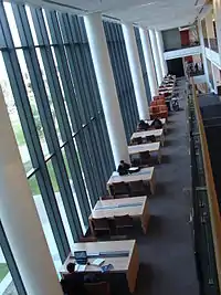 Public computers are available. Student, faculty and staff have access to over 200 wireless laptops, a media production lab for editing digital video and audio, and an instruction and collaboration center (Studio 2) for teaching information literacy skills. Reference assistance can be accessed by telephone, e-mail, instant messaging, text messaging, and in-person in the Library.[19]