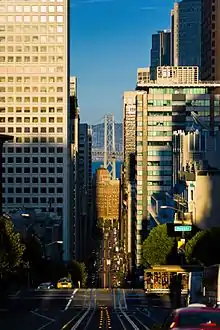 ![]() View from the top of California Street Looking towards the financial district with the Bay Bridge in the background | |
