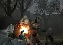 Most of the ranged weapons are based on real firearms with the exception of a Yithian directed-energy weapon introduced at the end of the game. The player character can also perform a melee attack with a crowbar or with a gun if all ammunition for it has been used up. The game features a realistic combat system: due to lack of HUD, the player has to count shots manually to know when the gun goes empty. There is also no artificial on-screen targeting reticle; instead, the player must aim through the iron sights on the weapons themselves, but sustained aiming tires the character and drops accuracy. The shooting system is unique in that fired rounds go exactly where the gun's barrel is pointing. For example, if the player character readies a reloaded weapon and the player pulls the trigger before the character animation has finished, the round will be discharged in the direction the gun was pointing when the shot was fired.