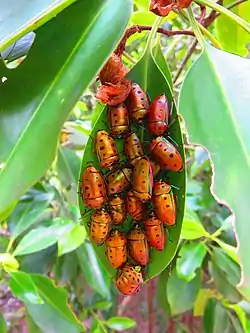 While the adults of this gregarious species may be found in large numbers on the leaves of any of its host species, the eggs are deposited only on the leaves of Excoecaria agallocha (commonly known as the "river poison tree", "blind-your-eye mangrove", "milky mangrove", or "buta-buta tree"), as the larvae feed only on the seeds of this plant.[6][8]