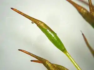 In bryophytes, the calyptra (plural calyptrae) is an enlarged archegonial venter that protects the capsule containing the embryonic sporophyte.[1] The calyptra is usually lost before the spores are released from the capsule. The shape of the calyptra can be used for identification purposes.[2]