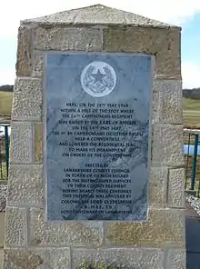 Face 5 of the British memorial on Spion Kop lists the names of the soldiers from the Cameronians who died at the Battle of Spion Kop during the Second Boer War.[32] The Cameronians War Memorial in Kelvingrove Park, Glasgow by Philip Lindsey Clark, unveiled on 9 August 1924, depicts men of the regiment manning a Lewis gun.[33] A monument commemorating both the founding of the regiment by the Earl of Angus in 1689 and its disbanding in 1968 can be found at Douglas, South Lanarkshire.[34] Also within the village is a statue of the Earl of Angus to commemorate the bicentenary of the raising of the regiment.[35]
