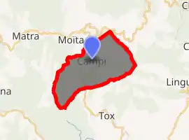 Campi is part of the canton of Moïta-Verde, together with 13 other communes: Aléria, Moïta, Ampriani, Canale-di-Verde, Chiatra, Linguizzetta, Matra, Pianello, Pietra-di-Verde, Tallone, Tox, Zalana and Zuani.[2]