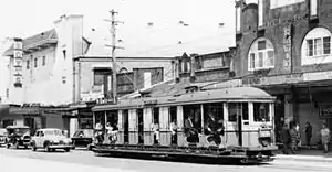 In 1921, a tram line was extended from Hurlstone Park to Canterbury Station, in 1927, a through service from Canterbury to the city commenced. The Canterbury line commenced at the Canterbury terminus in Broughton Street where a tram turning loop was provided.[6] Trams travelling towards the City or Balmain headed north-east along Canterbury Road. A service that was provided for by the Darling Street Wharf trams branched off from the main line at New Canterbury Road and connected with lines running along Parramatta Road for Balmain. Services heading towards Marrickville, Newtown, Sydenham and Tempe turned right into Marrickville Road.[7] The line from Dulwich Hill to Canterbury branched off from the Tempe line at Newtown, travelled along Enmore Road, then Victoria Road, before tuning right onto Marrickville Road and all the way through to Canterbury Road to the Canterbury terminus.[7]