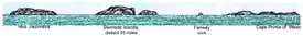 The cape is the eastern tip of a high, rocky headland, about 20 kilometres (12 mi) from Uelen in the north to Cape Pe'ek in the south, connected to the mainland by a neck of lower-lying land peppered with swamps and shallow lakes. That low-lying land is so low in elevation that the cape appears as an island from a distance far to the south of it. The US Hydrographic Office publication Asiatic Pilot from 1909 gives the height of the headland as 2,521 feet (768 m), and the US Office of Coast Survey chart of 2000 shows the highest peak at 2,638 feet (804 m). The headland and the neck of low-lying land together form a peninsula. A well-established trail crossed the neck of land behind the headland in pre-historic and historic times, traversed by sleds in the winter and used as a portage in the summer to avoid traversing the strait. This route was important enough that, according to an analysis by linguist Michael Krauss, the Central Siberian Yupik language continued up the coast, un-interrupted by the Naukansky dialect spoken in Naukan village on the headland.