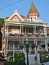 Several fires destroyed portions of the town and the mostly wooden, frame-built houses. The fire of 1878 destroyed about half the town, but many buildings were quickly rebuilt. This fire gave a particular boost to Button's career, and many of the local builders appear to have copied Button's style at this time.[5] These newer buildings were built with gingerbread trim, gables and turrets.[11][12]