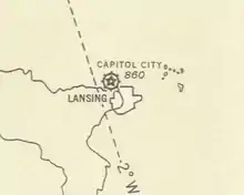 The first planes flew from the site northwest of Lansing on May 1, 1926.[11] The formal dedication of Capital City Airport was held on the weekend of July 14–15, 1928, and attended by 70,000 people, including arctic explorer George Hubert Wilkins and aviator Carl Eielson. Pilots from Selfridge Field and members of the Michigan National Guard 107th Observation Squadron performed in an exhibition air show.[12] A Stinson Detroiter plane arrived at the airport with Lansing's first air mail delivery on July 5, 1928. Mayor Laird J. Troyer, Chamber of Commerce President Alton J. Hager, and airport committee chairman Clyde B. Smith, among others, were present to witness the plane's arrival.[13] Regular cargo service from Capital City Airport began on July 17, 1928, via Transamerican Airlines. That day pilot C.V. Pickup departed with five sacks of mail en route to New York City. Lansing postmaster Walter G. Rogers was among those present to witness the event.[14]