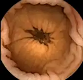 Esophagogastroduodenoscopy (EGD), employs a camera attached to a long flexible tube to view the upper portion of the gastrointestinal tract, namely the esophagus, the stomach and the beginning of the first part of the small intestine called the duodenum, and a colonoscope, inserted through the rectum, can view the colon and the distal portion of the small intestine, the terminal ileum, however, these two types of endoscopy cannot visualize the majority of the middle portion of the small intestine. Capsule endoscopy is used to examine parts of the gastrointestinal tract that cannot be seen with other types of endoscopy. It is useful when disease is suspected in the small intestine, and can sometimes be used to find the site of gastrointestinal bleeding or the cause of unexplained abdominal pain, such as Crohn's disease. However, unlike EGD or colonoscopy it cannot be used to treat pathology that may be discovered. Common reasons for using capsule endoscopy include diagnosis of unexplained bleeding, iron deficiency, or abdominal pain, searching for polyps, ulcers and tumors of small intestine, and diagnosis of inflammatory bowel disease.[2] The images collected by the miniature camera during a session are transferred wirelessly to an external receiver worn by the patient, using any one of a band of appropriate frequencies. The collected images are then transferred to a computer for display, review and diagnosis.[3] A transmitted radio-frequency signal can be used to accurately estimate the location of the capsule and to track it in real time inside the body and gastrointestinal tract.[4] It is unclear if capsule endoscopy can replace gastroscopy for those with cirrhosis.[5]