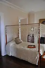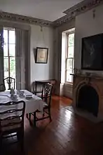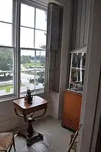 The Palmer House is set on a point of land separating Quanaduck Cove from Lambert Cove to the north of Stonington Borough, the township's coastal village. It occupies a 4-acre (1.6 ha) plot of land, all that is left of extensive Palmer family holdings. It is a roughly square wood frame structure, three bays wide and 2-1/2 stories in height, with a kitchen ell. The roof is hipped, with a gable at the center of each facade. At the center of the roof is an octagonal cupola with windows providing a 360-degree view. The main entrance is sheltered by a flat-roof portico supported by pairs of fluted and tapered Corinthian columns, with paired paneled pilasters flanking the double door. The windows on the main facade are framed by molded cornices with consoles. Roof lines of the main roof, portico, and cupola have dentil-like consoles and brackets. The interior of the house follows a central hall plan, with four rooms on each floor. The public rooms have particularly well-executed plaster, woodwork, and marble decoration. Of particular note is the captain's study on the ground floor, which features built-in cabinetry with shelving for nautical charts with mahogany-veneered paneled doors.[3]