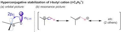 - Strictly speaking, the hyperconjugative stabilization of alkyl-substituted carbocations is a type of three-center bonding. Geometrically, the C–H bonds involved in hyperconjugation are observed (or computed) to "lean" slightly toward the carbocationic center as a result (that is, the C+–C–H bond angle decreases somewhat). Nevertheless, the hydrogen atom is still primarily bonded to the carbon α to the cationic carbon. To qualify as a non-classical carbocation, the two-electron three-center bond needs to feature a group equally (or nearly equally) bonded to two electron-deficient centers. In practice, there is a continuum of possible bonding schemes, ranging from slight involvement of a neighboring group (weak hyperconjugation) to equal sharing of a group between adjacent centers (fully non-classical bonding).