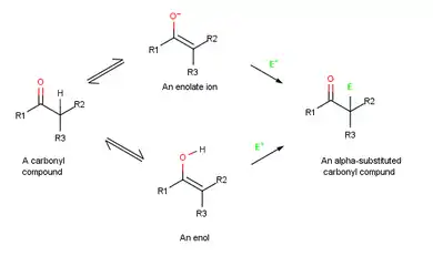 Alpha-substitution reactions occur at the position next to the carbonyl group, the α-position, and involve the substitution of an α hydrogen atom by an electrophile, E, through either an enol or enolate ion intermediate.[1]