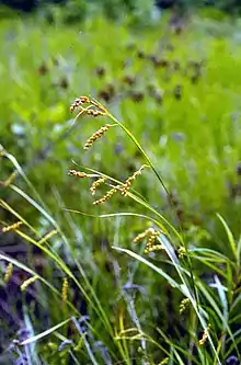 It grows up to 3 ft (0.91 m) tall, forming loose clumps, with leaves up to 1 ft (30 cm) long and about 0.3 in (8 mm) across. The underside of the leaves are typically slightly hairy, but may be glabrous (hairless), especially further west. The base of the culms and basal leaf sheathes are dark red when young, becoming brown as they age.[4] Each flowering stem has between two and five spikelets that droop at maturity from peduncles up to 1 in (25 mm) long. The terminal spikelet is staminate (male) at the base and pistillate (female) at the tip, a form known as androgynous. The mature lateral spikelets each have 12–30 plump perigynia. The perigynia are 4–5.5 mm (0.16–0.22 in) in length and 2 mm (0.08 in) across, ovoid with a short beak, and become orange-brown as they mature. The perigynia are subtended by awned scales up to 0.5 mm (0.02 in) in length, with the scale body shorter than the mature perigynia, but the awn often exceeding it in length.[5][6][7]