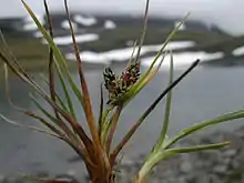 This species is a perennial herb growing up to 15 centimetres (6 in) tall. It has sheathed, grasslike leaves no more than 2 millimetres (0.08 in) wide. The lower spikes are female, while the terminal spike is gynecandrous. This inflorescence is often hidden in the leaves, which form a dense tussock.[1][2] The species often reproduces clonally.[3]