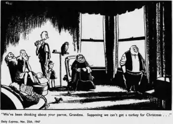 Giles later said that he never agreed with the Daily Express's politics, and felt guilt for abandoning the more left-wing Reynolds News for it, but it made him wealthy: by 1955 he was being paid £8,060 per annum (equivalent to about £200,000 at 2018 prices) for producing three cartoons a week.[3]