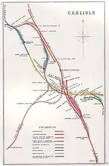 Indirect evidence that the NBR never used Canal station is given by the short-lived station at Port Carlisle Junction. To get to Carlisle Canal station trains from Silloth, Port Carlisle and the Waverley Route had to swing south east at Port Carlisle Junction; to get to Carlisle Citadel they had to swing north east at the junction then join what is now the West Coast Main Line at Port Carlisle Branch Junction. The Caledonian Railway (Caledonian) then charged monies for (and created obstructions against) using the last nine tenths of a mile to Citadel. The physical Port Carlisle junction came into use on 29 October 1861 and would have allowed Silloth and Port Carlisle trains to divert to Citadel there and then. Instead, among all the jostling between the big Scottish rivals, the NBR built a station at Port Carlisle Junction, which first appeared in Bradshaw in July 1863.[4] Research is needed on which of Silloth, Port Carlisle and Waverley Route trains called at the new station and whether they terminated or continued to Canal or Citadel, but the station's only vaguely practical purpose appears to be for passengers and parcels from the Silloth and Port Carlisle lines wishing to travel to Citadel and beyond to change to NBR services for the last lap, thereby avoiding hassle and fees, and the reverse in the opposite direction. This, however, is cast into doubt by the location of at least one platform which survived long after closure and may have survived at least until 2011. This suggests that, in contrast to Quick's map 20 [5] the station was north of the junction on purely Waverley Route metals, not being available to Silloth line customers at all.[6] From the Disused Stations article it appears that the confusion over the junction's name has spread far into the future.