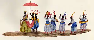 The painting on the top right, is called "The Queen and Her Suite." This picture above has nothing do with shown costumes. This was a parade that was being held in Brazil in the King and Queen of Brazil in their honours. Carlos Julião attended drawing classes which prepared Portuguese officers assigned around the empire to collect visual information about the peoples and territories colonized by the Portuguese. For six years, Julião served in India and illustrated a manuscript called "Noticia Summária do Gentilismo na Ásia", where with drawings and texts he reproduced Hindu beliefs of Brahman tradition.[9] These images are included in the catalogue "Riscos Iluminados de Figurinhos de Negros e Brancos dos Uzos do Rio de Janeiro e Serro Frio" maintained by the National Library in Rio de Janeiro, which was published in 1960. The title of the catalogue refers to 43 watercolor drawings portraying indigenous, military, costumes, slaves and their activities including diamond mining. Ethnographic representations of colonial Brazil; an ethnographic record of great utility to the authorities that run the empire. In the same catalogue are also included 33 drawings of Peruvian indigenous ceramic objects and textiles, confiscated from a Spanish shipwreck at Peniche in Portugal.[10] On the back of these drawings, there are watercolor sketches representing the culture of Portugal’s central plateau where Peniche is located. The three groups of illustrations related to India, Brazil and Peru were published in 1960 by the National Library but they were already property of the institution since 1947, after they were acquired from an anonymous seller, residing in the United States. Its publication in 1960 commemorated the 500th anniversary of Prince Henry, the navigator alongside with various events and publications which happened that year simultaneously in Portugal and Brazil. Less known but also published that year in the exhibition catalogue "Engenharia Militar no Brasil e no Ultramar Português Antigo e Moderno",[11] are the two works preserved by the department of archaeological studies in military engineering at Lisbon. One is illustrated on the top by a view of the city of Salvador da Bahia taken from the bay, with the building numbered with legends. Other elements were added to the composition, such as the plans of the city fortresses and similar figures to the "Riscos Iluminados" catalogue, representing the city’s population of masters and slaves. The other work shows four views of the city ports of Rio, Goa, Daman e Macao, as well as various figures representing those regions of the empire.