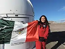 Less than two weeks after the trip, she applied to study communication and electronic engineering at Monterrey Tech, graduating in 2003.[1][2][3] Unfortunately, she was the only one at the school at the time interested in space. Despite this, she attended space conferences and other events such as the National Astronomy Congress, which allowed her to meet people in her future field.[1][2] She was also invited to join a project to conserve Chipinque Park in Monterrey, which has an observatory. It had been out of use for some time and she worked to reactivate it. She then gave classes and workshops on astronomy to student visitors.[2]