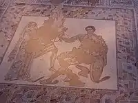 The oecus, where the owner held meetings and banquets showing off his social status, was ended by a raised exedra. The mosaic depicts the death of Adonis. Two dogs named Leander and Titurus are also represented.