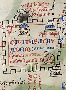 | 1140s[22] | Cambrai map | unknown | From the Médiathèque d'agglomération de Cambrai. It is considered to be the most accurate of the Crusader maps,[23] highly likely to be based on direct knowledge.[22] The walls of the city are shown in the shape of a rhomboid, from an elevation perspective.[22] The map provides names for gates and towers, shows some main streets, and marks the main buildings and churches.[22] The Holy Sephulchre is shown in its new Crusader form and labelled "Anastasis", the Al Aqsa Mosque is labelled "Domus Militum Templi", and numerous eastern churches are shown – Mar Saba, Chariton's lavra, St George, St Abraham, St Bartholomew, and the Jacobite church of St Mary Magdalene.[23] | ![]() |