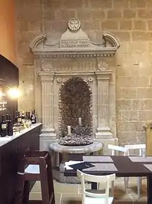 Casa Cosmana Navarra is considered as a traditional Maltese townhouse.[32] It has a vernacular and modern facade, that includes a closed timber balcony and two neoclassic columns uncommon to the time. In the inside it features some baroque architecture[33] including the coat-of-arms of the family, the decorative archways from a room to the other upstairs, and features in the former courtyard (now a room as well). It has several spacious rooms inside. Most of the building is a restaurant and open to the public.[34][35]
