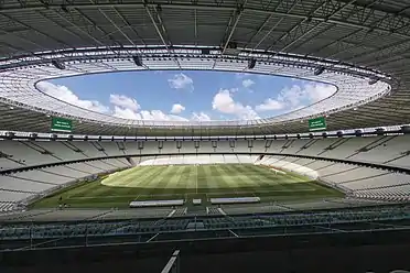 Castelão was one of the venues of the 2014 FIFA World Cup, which took place in Brazil. The stadium was redeveloped for the tournament; the reconstruction project, led by Uruguayan architect Héctor Vigliecca, involved the addition of a larger roof, the construction of an underground car park with 4,200 spaces, and a new lower tier. After the redevelopment, the stadium now has an all-seater capacity of 63,903.[4] The stadium closed on March 31, 2011 for the reconstruction project, which was officially completed in December 2012.[5] Castelão was the first of 12 stadiums being built or redeveloped for the 2014 World Cup to be completed.[5]