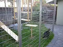 When a cat enclosure is constructed outdoors, it is used to prevent cats from wandering off where they may become lost, endangered by cars, or eaten by predators. Cat enclosures may also be constructed outdoors in order to provide a predominantly indoor cat a means of exploration and outdoor enrichment, while maintaining their safety.[1][2] Domestic cat breeders may use indoor cat enclosures to separate animals or encourage selective breeding. One specific situation where a cat enclosure is particularly useful is when a cat is moved from one house to another.[3] Cats have an instinctive drive to return home, often called a 'homing instinct',[4] which is normally beneficial, but can endanger the cat immediately after a move if the distance between homes is significant. Placing a cat in an outdoor enclosure when it reaches its new home will prevent the cat from performing this instinctive behaviour.