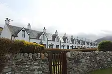 The Norse name for the tiny village of Catacol itself is The gully of the cat.[4] The village of Catacol has a row of low white terraced cottages called the 'Twelve Apostles'.[5] They were built to house those people cleared from the surrounding countryside, when much of the interior of the island was set aside for deer. The theory was these former farmers would turn to fishing, and with this in mind, each of the twelve cottages had a differently shaped first floor window. This would allow the woman of the house to signal by placing a candle in the window to her husband out while he was out fishing in the Firth of Clyde. The husband would know who was being signalled by the shape of the window. In reality, most of the dispossessed moved away to other parts of the island in protest against their eviction.
