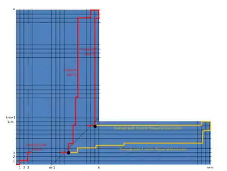 Thus the number of paths from to that do not cross the constraint is as indicated in the formula in the previous section "Generalization".