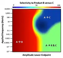 Application of dynamic binding energy to a surface with multiple catalytic reactions exhibits complex behavior derived from the differences in the natural frequencies of each chemistry; these frequencies are identified by the inverse of the adsorption, desorption, and surface kinetic rate parameters. Considering a system of two parallel elementary reactions of A-to-B and A-to-C that only occur on a surface, the performance of the catalyst under dynamic conditions will result in varying capability for selecting either reaction product (B or C).[12] For the depicted system, both reactions have the same overall thermodynamics and will produce B and C in equal amounts (50% selectivity) at chemical equilibrium. Under normal static catalyst operation, only product B can be produced at selectivities greater than 50% and product C is never favored. However, as shown, the application of surface binding dynamics in the form of a square wave at varying frequency and fixed oscillation amplitude but varying endpoints exhibits the full range of possible reactant selectivity. In the range of 1-10 Hertz, there exists a small island of parameters for which product C is highly selective; this condition is only accessible via dynamics. [13]