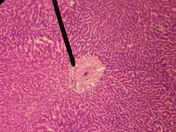 ![]() A single lobule of the liver of a pig. X 60. (Central vein not labeled, though region is visible. Central vein would be a single vein at the center of the lobule.) | |