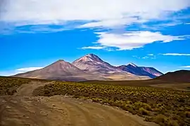 The mountain is constructed from andesite and dacite.[3] Volcanism of Canapa was influenced by local northwest-striking normal fault zones which also affected the Luxsar and Toconce volcanoes.[4] The range is partially underpinned by modern ignimbrites. Canapa has deposits left by solfataras.[5] The volcanic range is 50–100 kilometres (31–62 mi) long and may have originated from deep-seated basement lineaments.[6] Volcanism is Pliocene-Pleistocene in age.[3]