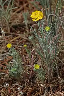 Chaenactis glabriuscula, with the common name Yellow pincushion, is a species of flowering plant in the daisy family. It is native to California and Baja California.[2]