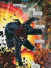 Jono resurfaced as Decibel, a member of Night Thrasher's most recent incarnation of the New Warriors.[11] In this new persona, Jono had a hi-tech suit, which gave him the ability to create solidified sound constructs. He revealed that he chose those powers because he did not want to be a weapon of destruction anymore and could now create.[12] He served with the group for the duration, until it was decided that they should disband. He was last seen departing in the company of Jubilee, and other surviving members of the team.