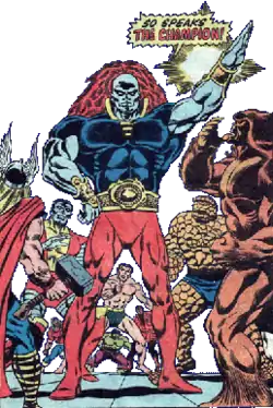 The Champion is one of the alien Elders of the Universe. He is an immortal who claims to have been born billions of years ago in the Ancrindo Nebula within the direction of the Magellanic Clouds. Although he wishes to prove himself the greatest warrior in the universe, he usually does so fairly. He keeps himself busy by fighting powerful warriors throughout the universe. The Champion of the Universe's Promoter Supreme named Proja preceded the Champion's journey to Earth and recruited eight of Earth's strongest male heroes (Champion having decided eons earlier that females were inferior and not worth fighting). Champion then forced their participation by threatening to destroy the planet should they not fight him for those unworthy of the glorious gift that is the true spirit of competition would be "purified". The Champion challenged the superheroes Thing, Namor, Hulk, Colossus, Sasquatch, Thor, Doc Samson, and Wonder Man to a boxing match in Madison Square Garden while a forcefield is around it and brought them to his extra-dimensional training facility to prepare for the match. The Champion ended up disqualifying Namor for refusing to stoop to training. Then he disqualified Doc Samson for not being sufficiently skilled to qualify as an opponent. When it came to the day of the boxing match, Thor was disqualified for throwing his hammer Mjolnir (he was allowed to use it since he was powerless without it), Hulk was disqualified because the Champion refused to "soil his hands on a mindless animal," Wonder Man was disqualified for tearing up the ring after being battered badly in the first round, Sasquatch was knocked out in the first round, and Colossus was defeated by technical knockout in the first round when he was unable to continue fighting. Alone of all of Earth's superheroes not previously disqualified, Thing managed to put up a semblance of fight against the Champion and lasted longer than any previous opponent the Champion had fought. Of all the opponents the Champion ever faced, only Thing lasted more than two rounds. Although the Champion fought Thing and ultimately defeated him with ease, Thing would not surrender, as he was convinced that the entire planet was in danger. Thing believed that everyone depended on him, and fought on despite broken bones and getting knocked out of the ring. Thing astonished the Champion with his resilience and courage leading the Champion to say Thing was the opponent he had sought through the ages, the one who would require all of his might and skill. His jaw broken and severely beaten after collapsing at the end of the third round, Thing crawled across the ring to demand the fight continue when the Champion claimed victory. When forced to choose between killing his defeated opponent or yielding, the Champion yielded. When Thing said he was "just too stupid and ugly to give up," the Champion replied he could never defeat Thing. He might break his bones and his body, but he could not break his spirit. The Champion then stated that any planet which could produce a champion such as the Thing was a truly worthy world.[2]