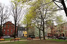 The .17-acre (0.069 ha) Thompson Square is located at the confluence of Main Street, Dexter Row, Green Street, and Austin Street.[16] Thompson Square station was formerly a stop on the Charlestown Elevated.