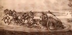 Later, where the quality of the road permitted, the range might be extended by the use of charrettes (carts). When designed for this trade, with a minimum of weight put into their construction and provision for harnessing the four horses, these vehicles took the name of chasse-marée. As speed was essential, they were normally hauled by two pairs of horses. The vehicle took the form of two wheels, of a diameter large enough to minimize the slowing effect of bumps in the road. On their axle was mounted an open rectangular frame within which were slung the baskets holding the fish, packed in seaweed. More baskets were stacked above.[4] The teams of usually fairly small horses were worked hard and changed at posting stations in the same way as those of mail coaches.[5]