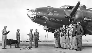 ![]() Gen. Jimmy Doolittle awards the Purple Heart to the aircrew of Boeing B-17E Fortress 41-9021 ‘Sweet Chariot’ at Chateau-dun-du-Rhumel Airfield, Algeria, July 1943. | |