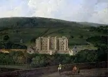 The name 'Chatsworth' is a corruption of Chetel's-worth, meaning "the Court of Chetel".[4] In the reign of Edward the Confessor, a man of Norse origin named Chetel held lands jointly with a Saxon named Leotnoth in three townships: Ednesoure to the west of the Derwent, and Langoleie and Chetesuorde to the east.[5] Chetel was deposed after the Norman Conquest and in the Domesday Book the Manor of Chetesuorde is listed as the property of the Crown in the custody of William de Peverel.[4] Chatsworth ceased to be a large estate, until the 15th century when it was acquired by the Leche family who owned property nearby. They enclosed the first park at Chatsworth and built a house on the high ground in what is now the south-eastern part of the garden. In 1549 they sold all their property in the area to Sir William Cavendish, Treasurer of the King's Chamber and the husband of Bess of Hardwick, who had persuaded him to sell his property in Suffolk and settle in her native county.