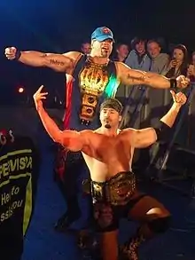 Soon after returning to the active roster, Guerrero was aligned with his uncle Eddie, forming the tag team Los Guerreros.[26] In contrast to his previous WCW storyline with his uncle, Guerrero fully adopted his uncle's policy of "Lie, Cheat and Steal" to win matches as part of the gimmick. Los Guerreros won the tag team championships at Survivor Series, when they defeated Kurt Angle and Chris Benoit and Edge and Rey Mysterio in a Triple threat tag team elimination match. The duo turned face due to their popularity. On the February 6, 2003 episode of SmackDown!, Los Guerreros lost their tag team championships to Team Angle. At WrestleMania XIX, they were again defeated by Team Angle in a triple threat match for the tag team titles, also involving the team of Benoit and Rhyno. They continued to feud with Team Angle and won the championships back on the September 18 episode of SmackDown!. One month later, they lost the titles to The Basham Brothers.[27] After losing their tag team championships, Guerrero became jealous of his uncle's growing popularity and WWE Championship ambitions, turned on Eddie, broke from the team, and turned heel again.[28] He was soon joined by his father Chavo Sr. who sided with his son instead of his brother.[29] Guerrero and his father teamed together to defeat Eddie and Kurt Angle on January 22, 2004 episode of SmackDown![30] Eddie, however, defeated Guerrero at the 2004 Royal Rumble to end their feud.[31]