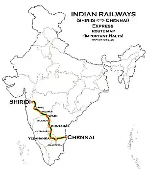 The 22601 / 02 Puratchi Thalaivar Dr. M.G. Ramachandran Central Railway Station–Sainagar Shirdi Superfast Express runs from Puratchi Thalaivar Dr. M.G. Ramachandran Central Railway Station via Arakkonam Junction, Katpadi Junction, Krishnarajapuram, Sathya Sai Prasanthi Nilayam, Guntakal Junction, Wadi Junction, Solapur, Daund Junction, Ahmednagar, Puntamba to Sainagar Shirdi.