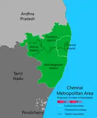 On 3 July 2017, the Government of Tamil Nadu's minister for housing and urban development, Udumalai K. Radhakrishnan announced its intention to expand the CMA to 8,878 km2 (3,428 sq mi). The extension will cover all of Kancheepuram and Tiruvallur districts and Arakkonam taluk of Ranipet district, as proposed in July 2012. Having completed a feasibility study, a "strategic regional plan" was now required, and completion of the whole process was expected by July 2018.[15][16]