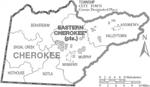 Cherokee County is the westernmost county in the U.S. state of North Carolina. It borders Tennessee to its west and Georgia to its south. As of the 2010 census, the population was 27,444.[1] The county seat is Murphy, population 1,627 (2010), elevation 1604 ft.[2][3]
